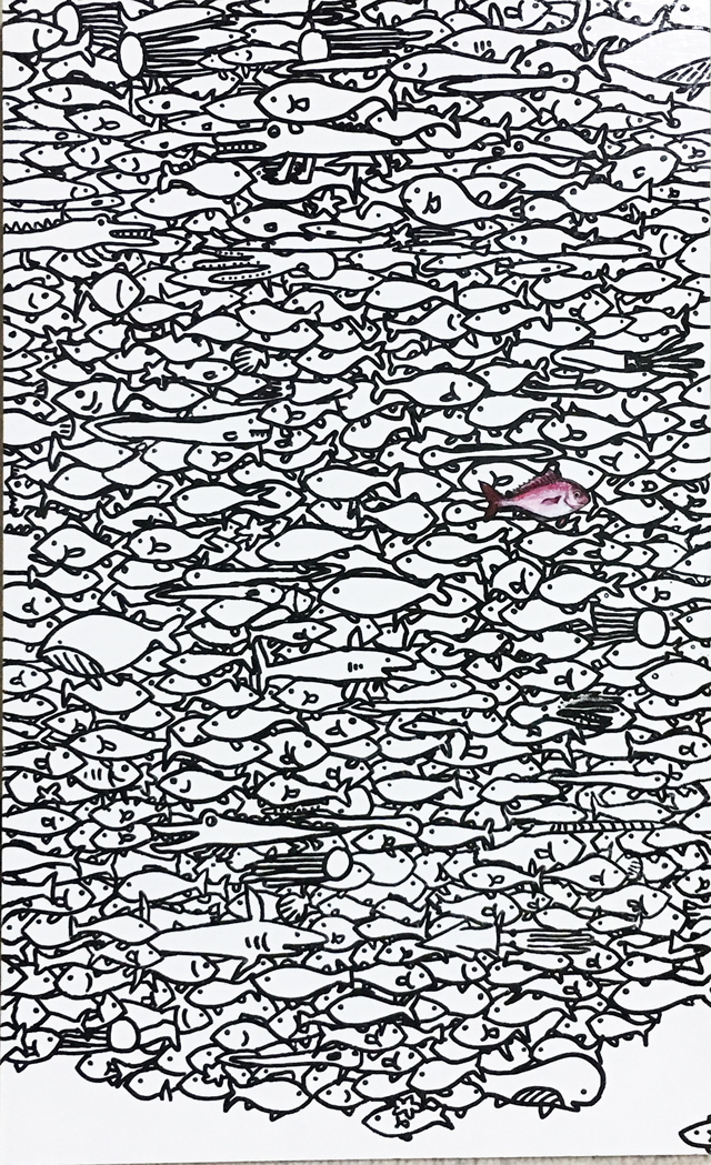 制作年:2017/08/23 タイトル:「水のいきもの」 サイズ:M6(W:240mm × H:410mm) 素材:木製パネル、アクリル絵の具 サービス:送料無料