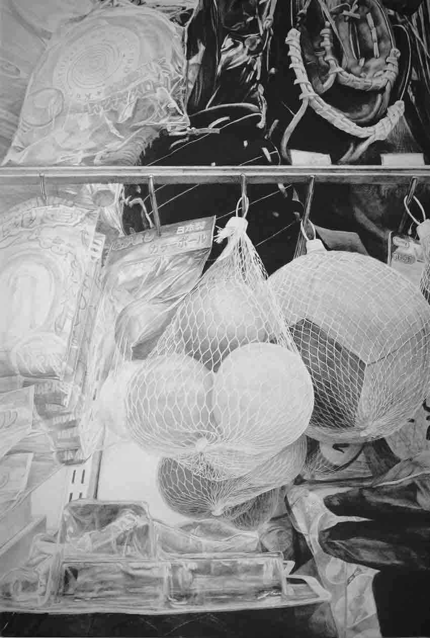 子どもの視点にたったことがあるだろうか。お店の商品は子どもの目線からは殆ど見えない現実がある。美術鑑賞も同じく、作品のそばに連れて行かれると見上げる角度が強すぎて正面から作品を鑑賞することが小さな子どもにはできない。そんな子どもたちが作品を下から見上げたときに「いつも目にする風景」を届けるため描いた作品となります。